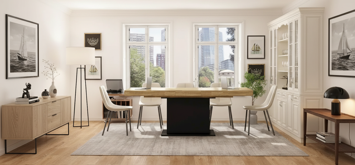 This large dining table features a delicate wood grain finish, exuding a simple